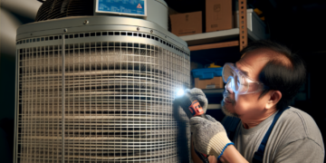 HVAC technicians inspect the external condition of the AC condenser. They determine if the AC condenser is level and assess the overall unit for rust. Additionally, they review the condenser fan for any problems.